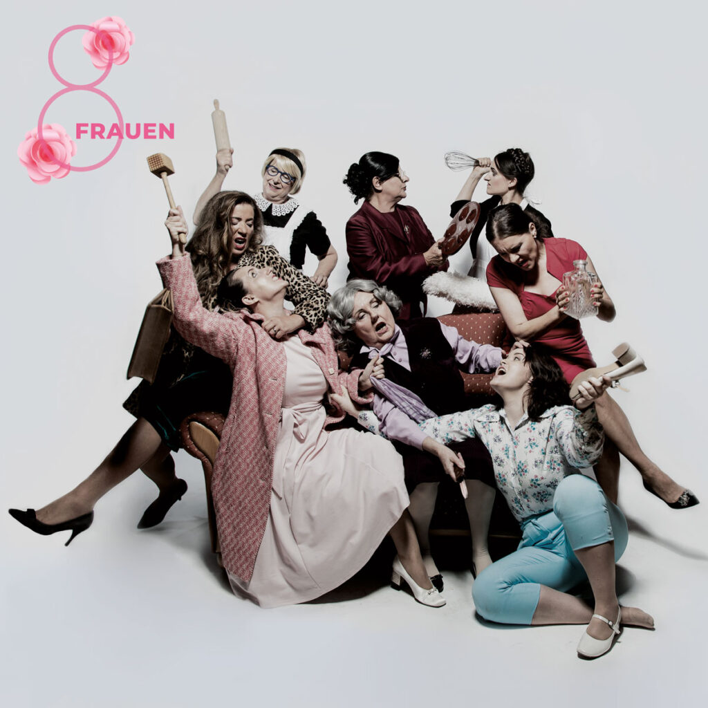 Wir freuen uns, mit Acht Frauen eine spannende Mischung aus Krimi, Musiktheater und feinem schwarzem Humor auf die Bühne zu bringen. „Acht Frauen“ ist mehr als ein klassisches „Whodunit“. Es ist wie ein Escape-Room auf der Bühne, moderiert von acht vielseitigen Spielerinnen. Nur dass der Schlüssel, den es zu finden gilt, nicht in der obligatorischen Schublade versteckt ist, sondern tief in den Geheimnissen der weiblichen Protagonistinnen vergraben liegt. Eine blutrot getränkte Komödie, in der sich acht Charaktere entblättern wie Rosen – und bei der man nie sicher ist, ob der nächste Tropfen, der fällt, Tinte, Träne oder Blut ist.