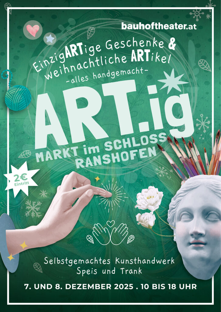 Das Schloss Ranshofen hat schon vieles erlebt – aber wenn sich seine Räume mit dem Glanz handgefertigter Werke füllen, scheint das historische Gemäuer selbst ein kleines Stückchen stolzer und aufrechter dazustehen. Beim ART.IG-Markt des bauhoftheaters präsentieren über 40 Künstler:innen und Kunsthandwerker:innen ihre Arbeiten – jedes einzelne Stück von der ersten Idee bis zum letzten Handgriff selbst gefertigt. Kein schneller Massenabguss, kein „nur zusammengebastelt“, sondern Arbeit, die Können, Geduld und eine Liebe zum Detail verlangt, wie sie nur erfahrene Hände kennen.